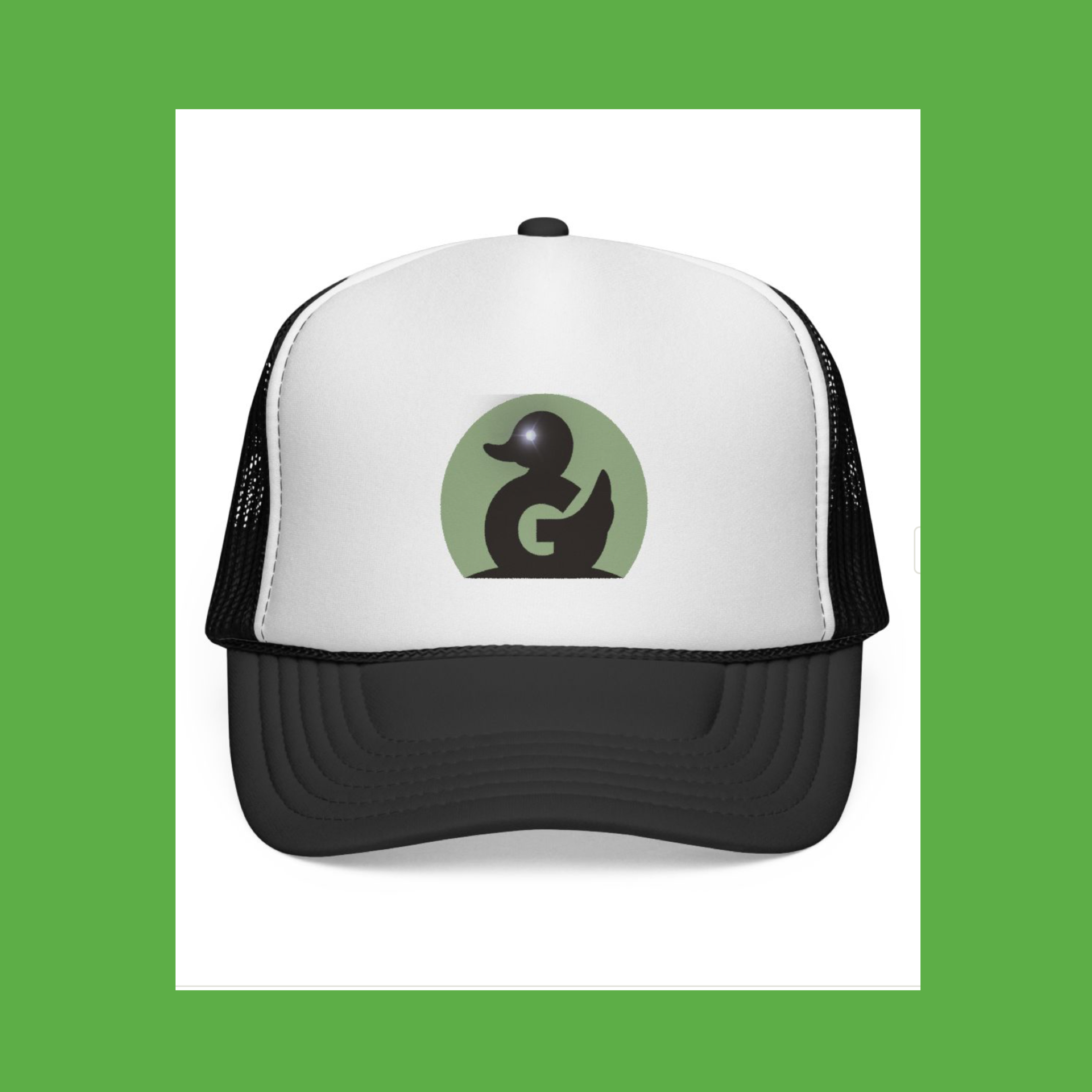 Green Duck Media Trucker Hat - Black & White Logo Cap, with shinny eye