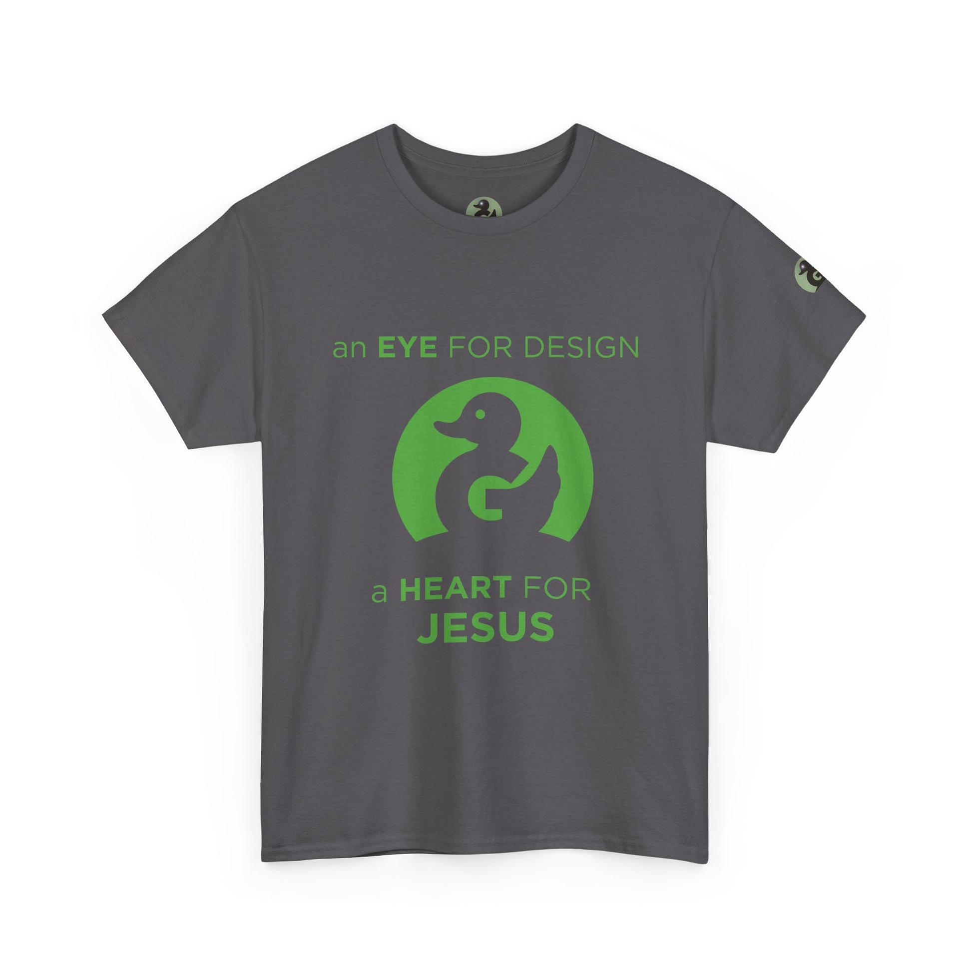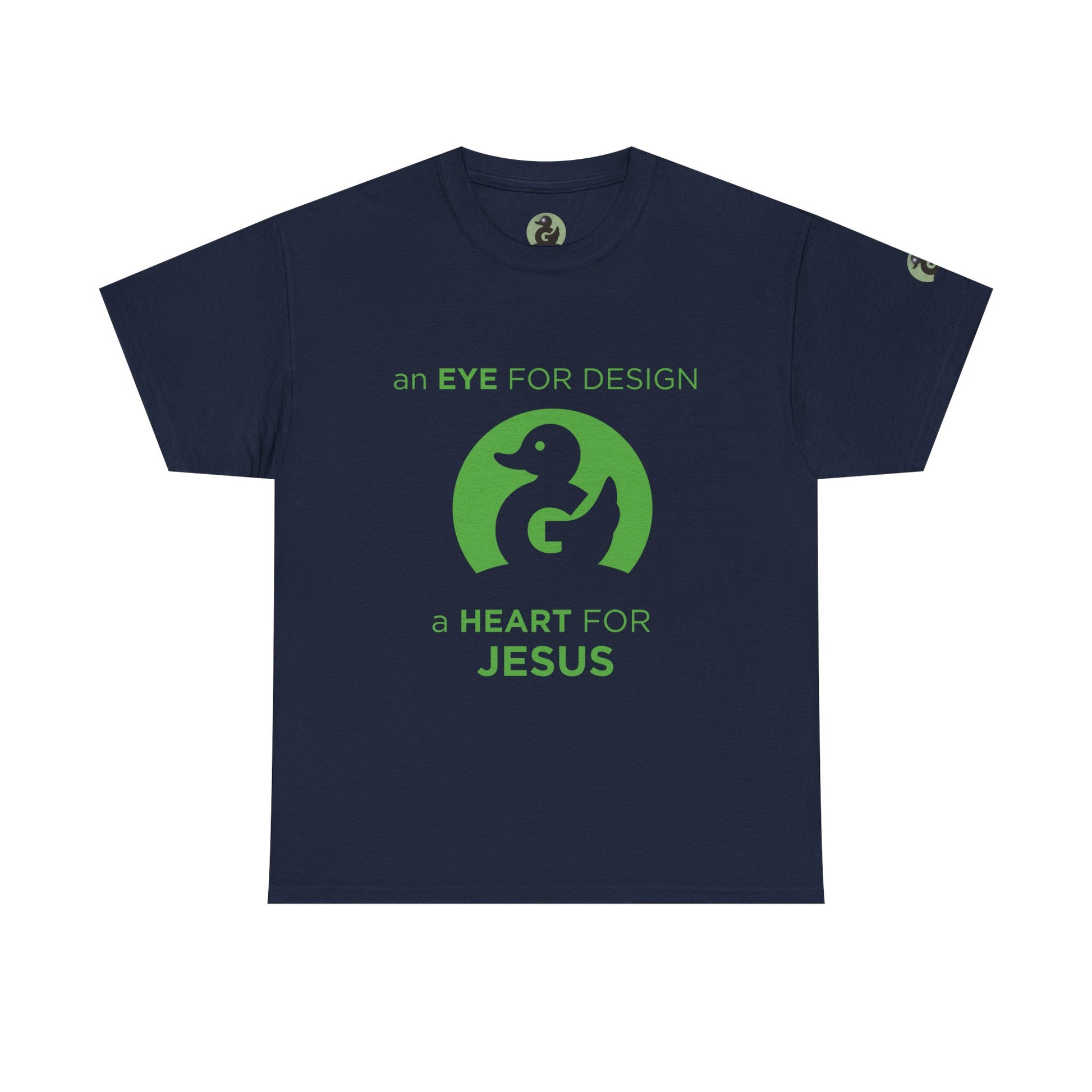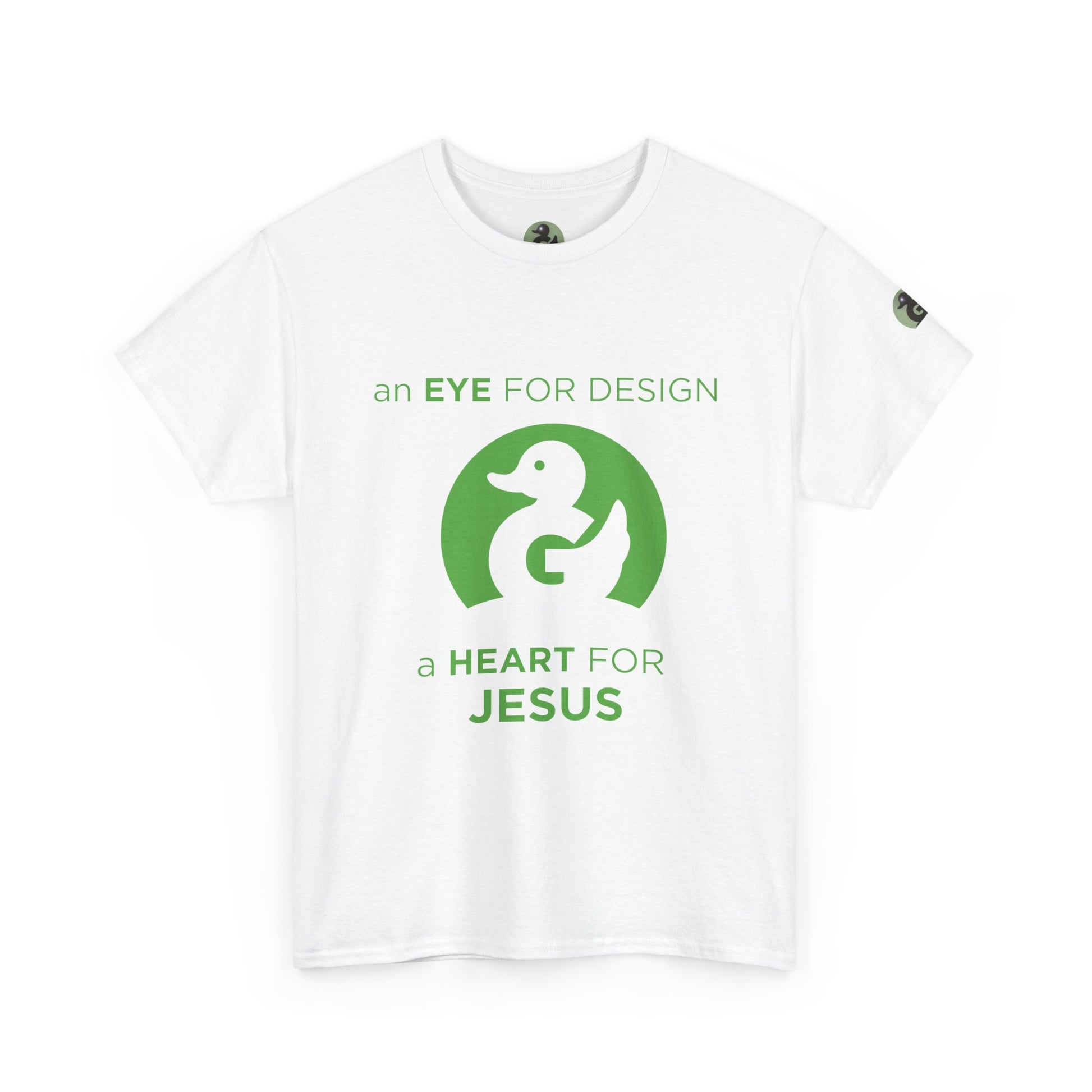 This soft, classic-fit tee brings gentle faith-forward messaging into everyday wear. The white cotton canvas features a simple green emblem and clean typography that reads "an EYE FOR DESIGN a HEART FOR JESUS," creating a calm, modern statement of craft and conviction. Lightweight yet sturdy, the shirt drapes casually with a crew neckline and ribbed collar that holds shape. Subtle printed accents on the sleeve and inner neck add designer touches without overwhelming the look. Wear it to church gatherings, creative meetups, or quiet weekends — it settles into your routine and speaks quietly about what matters to you.