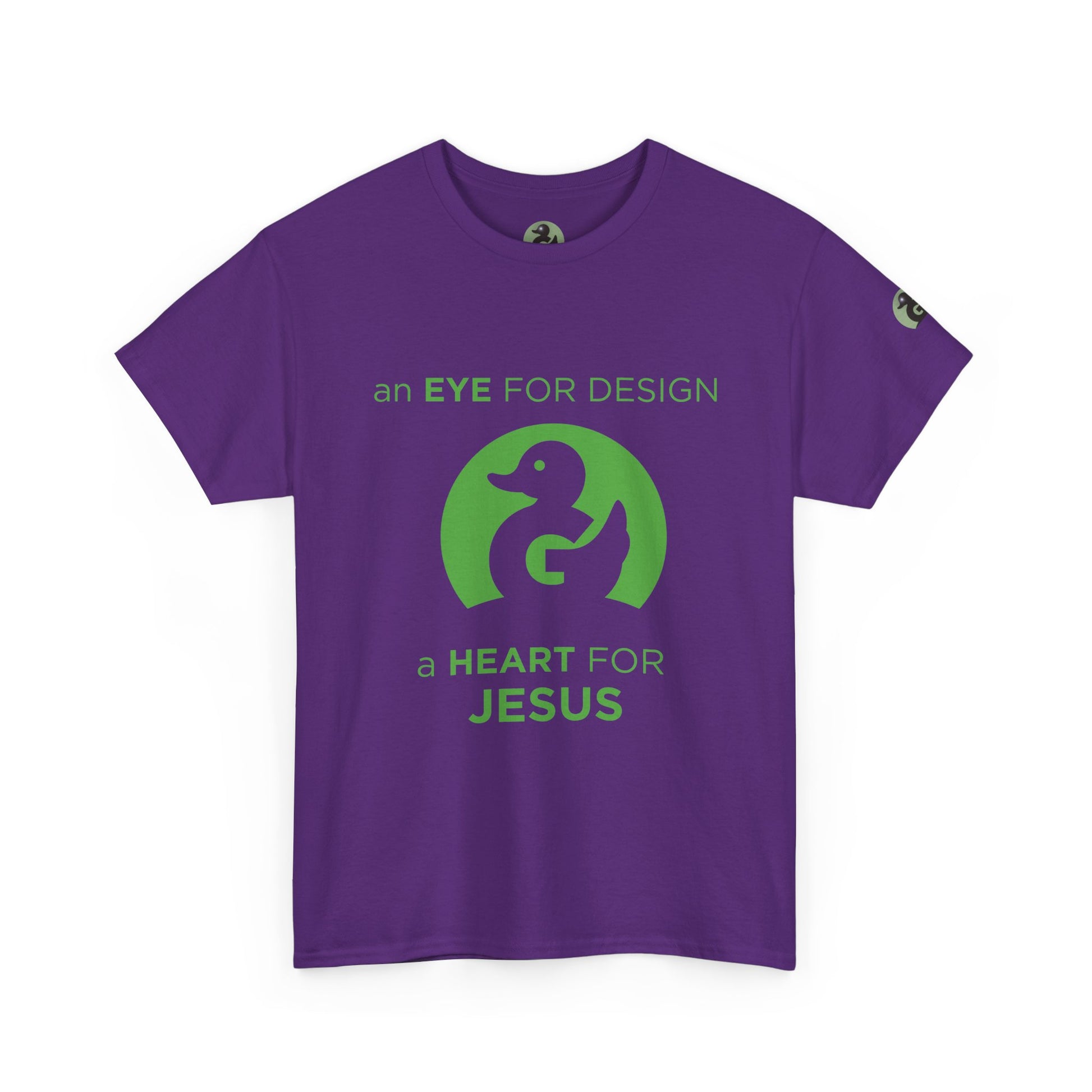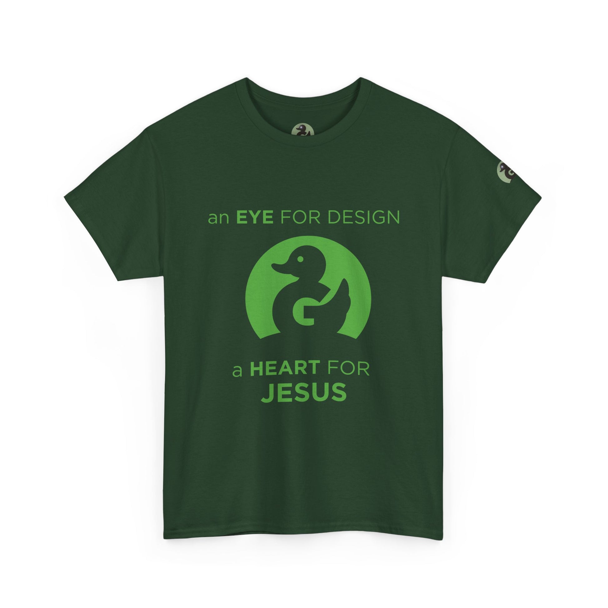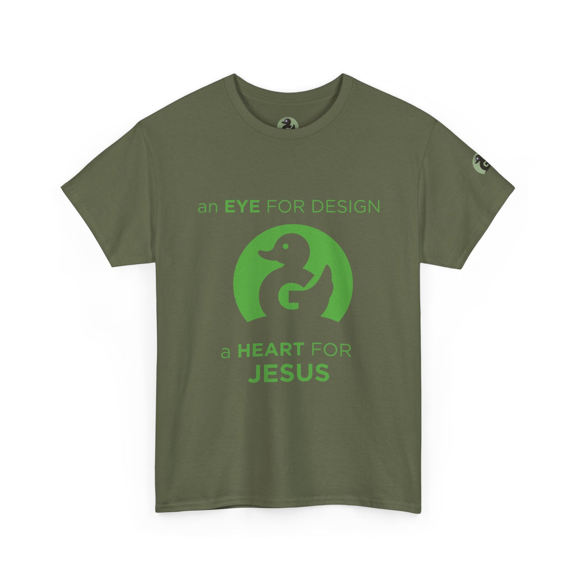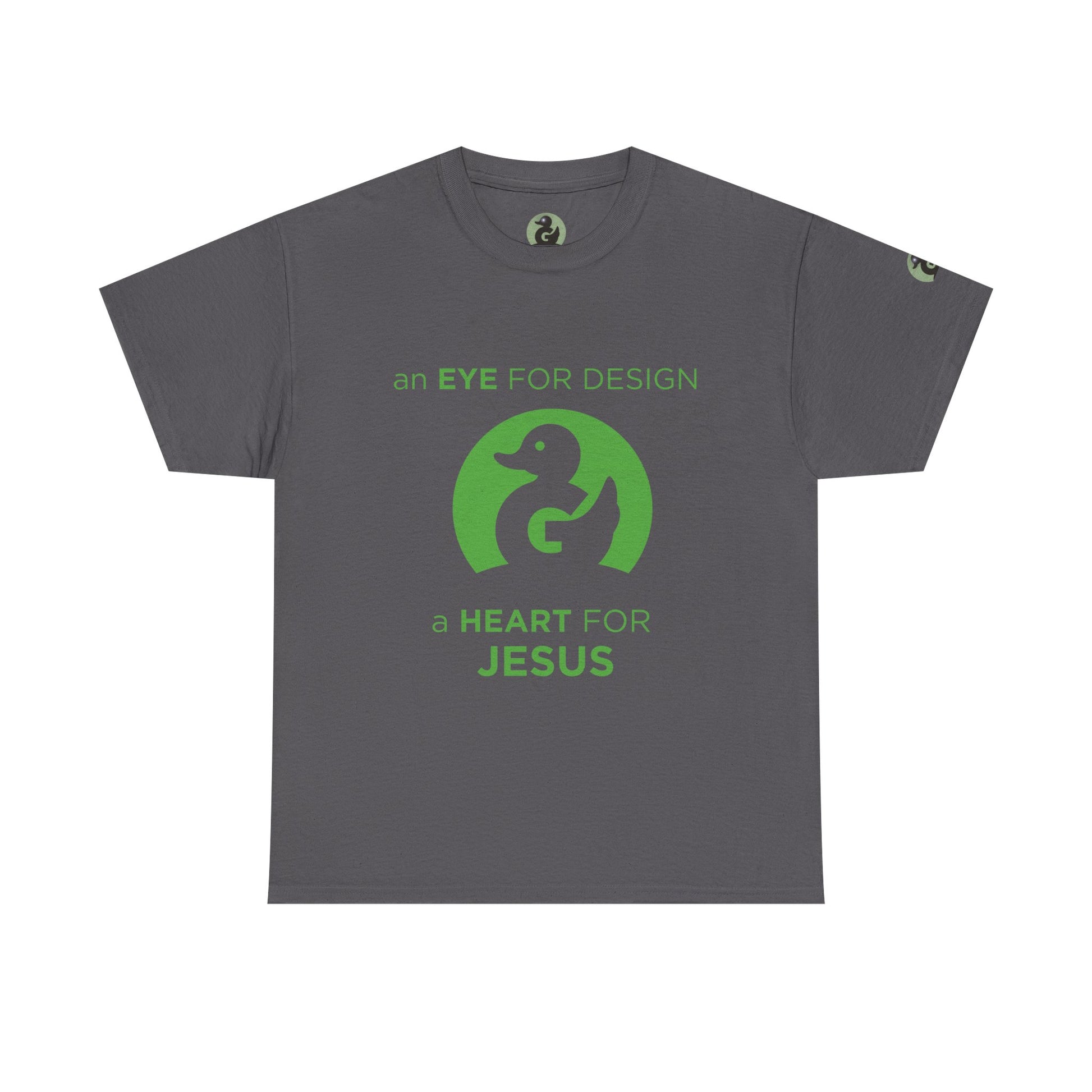 This soft, classic-fit tee brings gentle faith-forward messaging into everyday wear. The white cotton canvas features a simple green emblem and clean typography that reads "an EYE FOR DESIGN a HEART FOR JESUS," creating a calm, modern statement of craft and conviction. Lightweight yet sturdy, the shirt drapes casually with a crew neckline and ribbed collar that holds shape. Subtle printed accents on the sleeve and inner neck add designer touches without overwhelming the look. Wear it to church gatherings, creative meetups, or quiet weekends — it settles into your routine and speaks quietly about what matters to you.